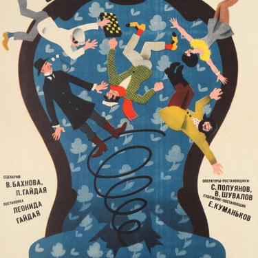 Original vintage Soviet movie poster for the Soviet comedy film Twelve Chairs / 12 стульев about a search for some missing diamonds hidden in a chair, directed by "the king of Soviet comedy" Leonid Gaidai and starring Archil Gomiashvili, Sergey Filippov, Mikhail Pugovkin and Natalya Krachkovskaya. Colourful illustration featuring characters from the film bouncing off a broken spring from a large old black and blue chair with the title in stylised black letters over the top of the chair. Very good condition, cracks in upper half.