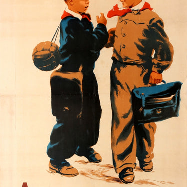 Original vintage Soviet movie poster for a family comedy film Two Friends directed by Victor Eysymont based on a book by the popular children's writer Nikolai Nosov (1908-1976) entitled Vitya Maleev in School and at Home. Great image featuring two school boys in red Pioneer scarves carrying their schoolbags and talking on their way home from school, the boy on the left wearing a blue uniform and carrying a football over his shoulder while the boy on the right is dressed in green and is smiling to his friend against a plain background, the title below in stylised bold letters with the credit text. Good condition, folded as issued, creases and cracks on fold lines, pinholes in corners.