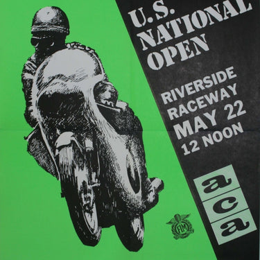 Original vintage motor sport poster for the US National Open at the Riverside Raceway in California on May 22, 1966 at 12 noon, organised by the ACA (American Cycle Association). Image of a motorcycle racer on a green background with the FIM (Federation of International Motorcycling) logo. Very good condition.