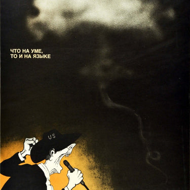 Original vintage Soviet propaganda poster featuring a caricature illustration of the American actor and President Ronald Reagan (1911-2004; President 1981-1989) wearing a black suit with a white neck scarf and a cowboy hat marked US on it, clenching his fist in the air and shouting into a microphone with his speech dispersing into a white cloud of smoke of nothingness against the black background, the Russian proverb text in white reading - Что на уме, то и на языке / What's on the mind is on the tongue - meaning a person being direct and speaking their mind without thinking it through first. Excellent condition.