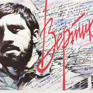 Original vintage Soviet movie poster for the 1988 re-release of a 1967 mountain climbing drama film Vertical (Вертикаль) directed by Stanislav Govorukhin (his directing debut) and Boris Durov, and starring Vladimir Vysotsky, Gennadi Voropaev, Larisa Luzhina and Bukhuti Zakariadze, with music by Sofia Gubaidulina and Vladimir Vysotsky. Great artwork with a drawing portrait of a man on the left in front of papers with handwriting and scribbling in the background, the title on the right in red letters. Horizontal. Very good condition, folded as issued, faint waving.