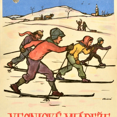 Original vintage winter sport poster - Village Youth Ski Run / Lyzarsky Béeh Vesnicke Madeze - featuring an illustration of a group of children skiing on cross-country skis watched and cheered on by a couple pulling a sledge through the snow with a horse and village church visible behind hills in the background, the logo and stylised lettering above and below. Printed in Prague. Good condition, folds, creasing, small tears, minor staining.