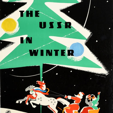 Original vintage Soviet travel poster issued by The USSR Company for Foreign Travel Intourist - Visit the USSR in Winter - featuring a fun and colourful design depicting a Vostok space rocket shooting into the night sky above a Christmas / New Year tree decorated with baubles in front of a white shadow, a horse drawn sleigh below led by a Father Christmas / Santa Claus driver with a couple smiling and waving to the viewer from the open sledge carriage. Good condition, restored tears, restored creasing, staining, backed on linen.