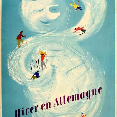 Original vintage ski and winter sport travel poster - Winter in Germany / Hiver en Allemagne - featuring a fun design by Hanns Lohrer (1912-1995) depicting people enjoying winter sports and skiing on a snowy ski slope in the shape of a smiling snowman on a pale blue background, including a person on a chair lift riding up through the image past a person relaxing in a striped deck chair to a mountain chalet building on the snowman's hand, a lady elegantly ice skating on its head, a skier skiing at speed down the piste, a cross country skier walking up on the side, two people taking a break with one sitting on the snow by their skis and poles, and a couple on a toboggan sledge below the diagonal title text. Printed in Germany. Good condition, restored tears, restored paper loss in top left corner, restored pinholes, staining, backed on linen.