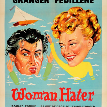 Original vintage cinema poster for the comedy film Woman Hater starring Edwige Feuillere and Stewart Granger and directed by Terence Young. Fun image featuring the faces of the two stars coming out of the water with Stewart Granger's character, Lord Terence Datchett, looking slightly scared while the French movie star character played by Edwige Feuillere, Colette Marly, is smiling and looking like she is having a lot of fun at his expense; behind them, a small boat is sailing away in the pale blue sea with the names of the actors above and the title below in red stylised lettering. Printed in England by W.E. Berry Ltd., Bradford. Very good condition, restored minor tears, folds, backed on linen.