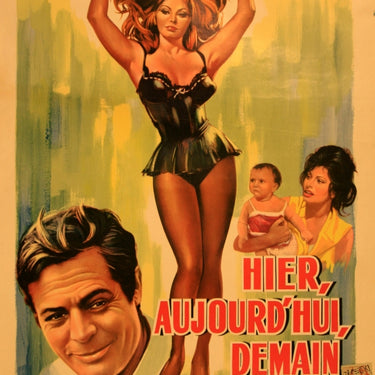 Original vintage movie poster for the 1963 Italian film: Yesterday, Today and Tomorrow (Ieri, Oggi, Domani / Hier, Aujourd'hui et Demain), starring Sophia Loren, Marcello Mastroianni and Aldo Giuffre. This poster is for the original release of the film in Belgium and has tax stamps attached. Good condition, folds.