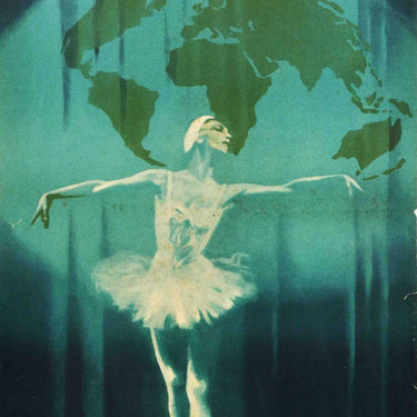 Original vintage Soviet film poster for a feature on the first International Ballet Competition for young ballet dancers held in Moscow - Молодой балет мира / Young World Ballet - showing a ballerina (possibly the prima ballerina Ludmila Semenyaka b. 1952) in an elegant pose in front of a world map shaded like a theatre curtain with the title above and the credits below. Now a firm tradition in the ballet world, this ballet competition was founded in 1969 by the legends of the Russian Ballet - Igor Moiseyev (1906-2007), Olga Lepeshinskaya (1916-2008) and Galina Ulanova (1910-1998) - held every four years and judged by an international jury; this first competition in 1969 was won by the renowned ballet dancer and choreographer Mikhail Baryshnikov (b. 1948). Artwork by the notable poster artist and Member of the Union of Cinematographers of the USSR Sergei Datskevich (1919-1977). Good condition, creasing, tears, small paper losses, staining, foxing.