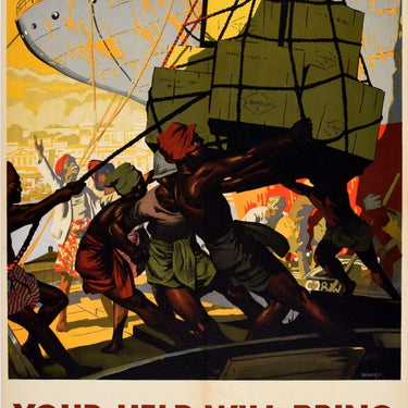 Original vintage World War Two propaganda poster - Your Help Will Bring Victory - featuring artwork by Alfred John Nunney (1897-1966) depicting dock workers unloading goods from a large cargo ship using a rope net suspended from a crane holding crates marked London 7, buildings in the background and the bold text on the margin below. There are two other versions of this poster with the same image but different text - "Help West Indies to Work for Victory" and "Help British Guiana to Work for Victory". Good condition, restored folds, small restored paper loss on bottom edge, minor staining, backed on linen.