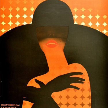 Original vintage Polish film poster for the 1969 French comedy movie Une Veuve En Or / Zlota Wdowka / A Golden Widow directed by Michel Audiard and starring Michele Mercier and Claude Rich featuring a great design of an elegant lady in a wide brimmed black hat covering her naked body with her long black gloved hands against a decorative black and orange shaded background. Artwork by Tomasz Ruminski (1930-1982). Excellent condition, couple of minor tears at left edge.